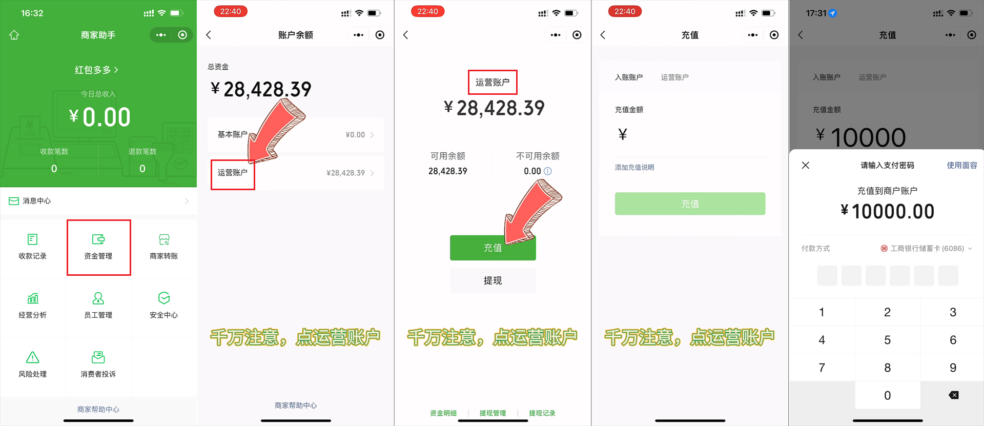 使用绑定过商户的微信,打开微信支付商家助手小程序,点击资金管理,选择运营账户,充值。