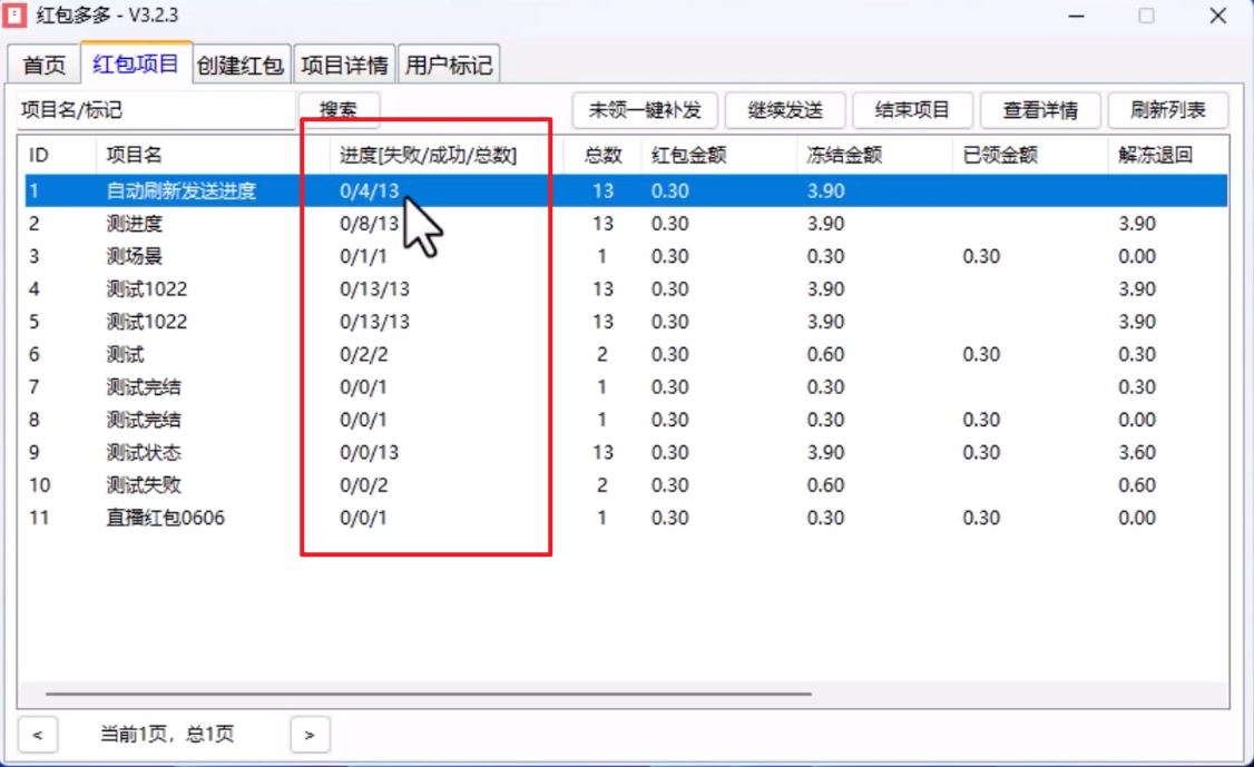 创建任务后,会在项目列表页生成一条项目信息,项目名旁边就会显示发送进度 失败/成功/总数 。随着红包的发放,这个进度数据会自动刷新。