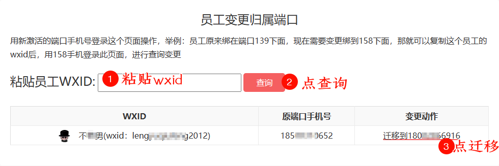 这个是将某个发红包的员工微信,从一个端口后台删除,变更迁移绑定到另一个新的端口下面。