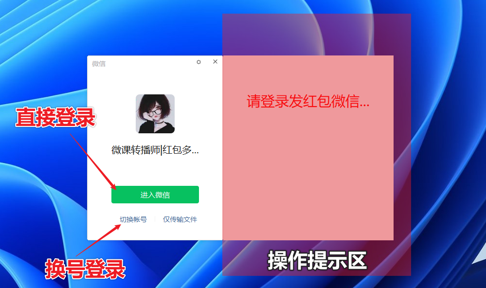 - 软件会自动打开微信登录界面,这时候您可以直接登录发红包的员工微信,也可以点击切换账号登录别的要发红包的员工微信