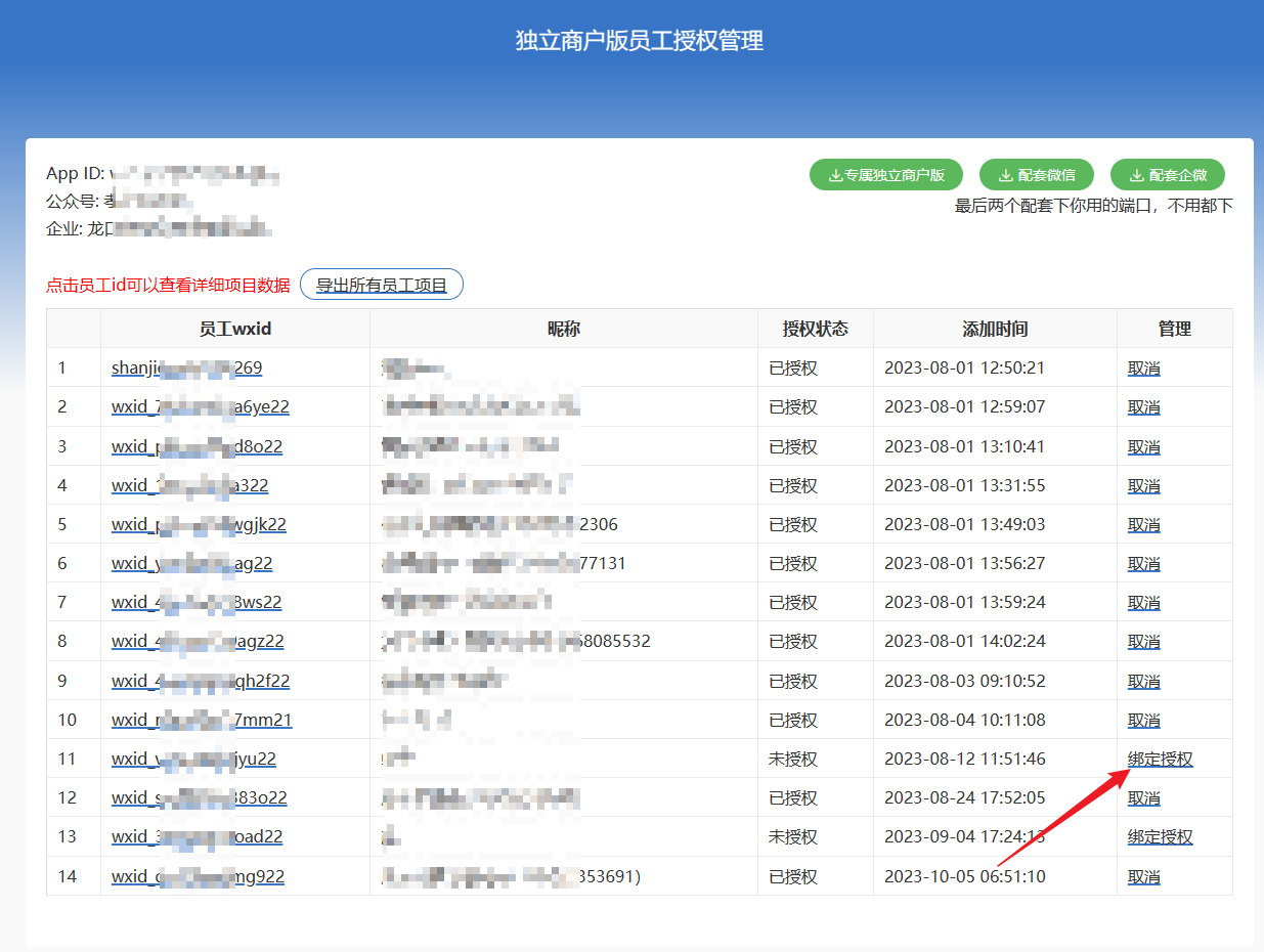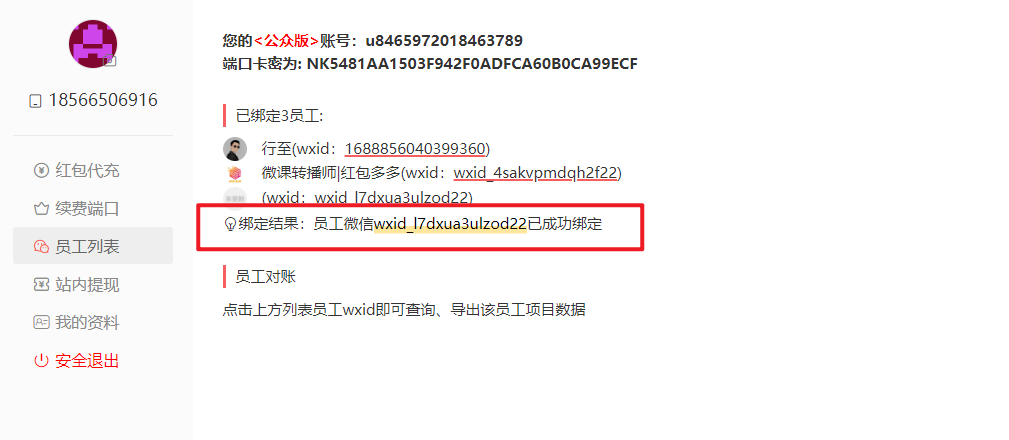 - 所有发红包的微信都叫员工微信,都需要绑定到端口。