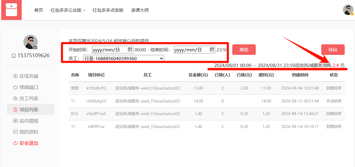 点击进入项目列表,选择员工,按日期查询,点击筛选按钮便可汇总出这一时间段该员工的所有项目,以及消耗的余额